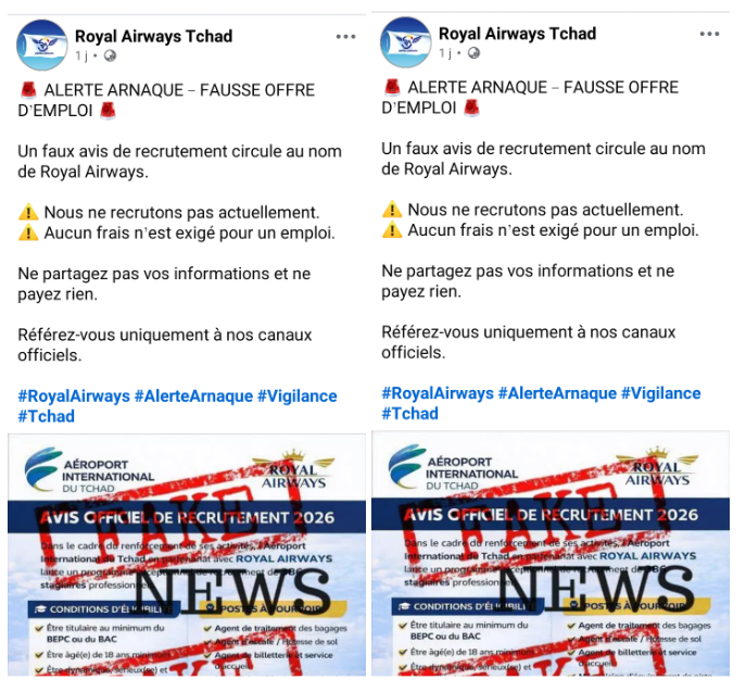 En conclusion, la publication facebook annonçant un recrutement conjoint de l’aéroport international Hassan Djamous de N’Djamena et de Royal Airways en février 2026 est fausse. Les autorités et la compagnie concernées n’ont lancé aucune initiative de ce type et appellent à la vigilance face aux annonces circulant sur les réseaux sociaux.