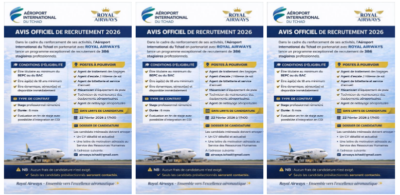 Une publication diffusée sur Facebook affirme que l’Aéroport international de N’Djamena et la compagnie Royal Airways auraient lancé conjointement une session de recrutement pour divers postes dans le secteur aéronautique, dont hôtesses de l’air, agents d’accueil, personnel de traitement des bagages et mécaniciens de surface. Selon la publication, les candidatures devraient être envoyées à l’adresse Airways.tchad@gmail.com avant une date du concours prévue le 22 février 2026.
